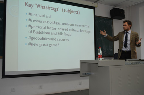 尼古拉•穆拉什基首先从日本外交政策的来源谈起,分析了日本的中亚外交政策的决定因素,并以“丝绸之路”为实例讲解了日本的中亚外交政策,最后对比中国、日本与中亚的关系,并解答了同学们的提问。