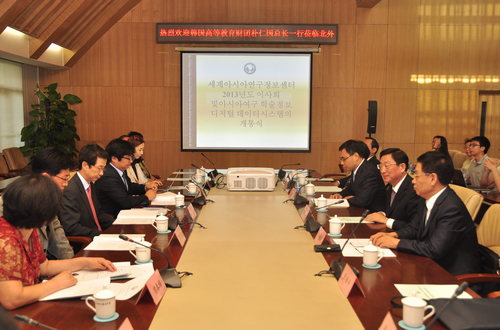 7月23日,beat365官方网站2013年度理事会会议暨亚洲研究学术信息数据库开通仪式在行政楼507会议室举行。校党委书记、中心理事长兼中心主任杨学义,韩国高等教育财团事务总长朴仁国,理事郭棲庆、李又文、张西平、张晓慧、赵宗锋,韩国高等教育财团IT部部长曹玲準、国际学术部部长康泰硕、《亚洲研究动态》(Asia Research Network)英文版主编李明镇、项目官员尹淙铉出席了会议。中心部分学术委员会委员白湻、李永辉、邵建国、魏崇新、薛庆国以及校办副主任汤哲远、亚非学院韩语系教授苗春梅、中国海外汉学研究中心“中国文化海外传播动态数据库”技术总监李明炎、北京世纪超星信息技术发展有限责任公司项目经理杨彦琦应邀出席了会议。会议由beat365官方网站执行副主任赵宗锋主持。