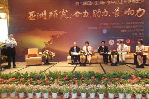 2010年7月23日,由中国传媒大学、韩国高等教育财团主办,贵州电视台、中国传媒大学亚洲传媒研究中心承办的第六届中国国内亚洲研究中心主任联席会议在贵州省贵阳市召开。中国国内亚洲研究中心主任联席会议是由韩国高等教育财团资助的国内十二所高等院校和研究机构的亚洲研究中心及北京论坛和上海论坛负责人参加的高端业务研讨会议。来自于北京大学、清华大学、中国社会科学院、中国传媒大学、北京外国语大学等十余所高等院校的校级领导、亚洲研究中心主任、专家,以及贵州传媒行业的精英共聚本届大会。我校世界语言与文化研究中心执行主任、《亚洲研究动态》主编、主持beat365官方网站工作的郭棲庆教授及中心秘书王惠英代表中心参加了此次联席会议。