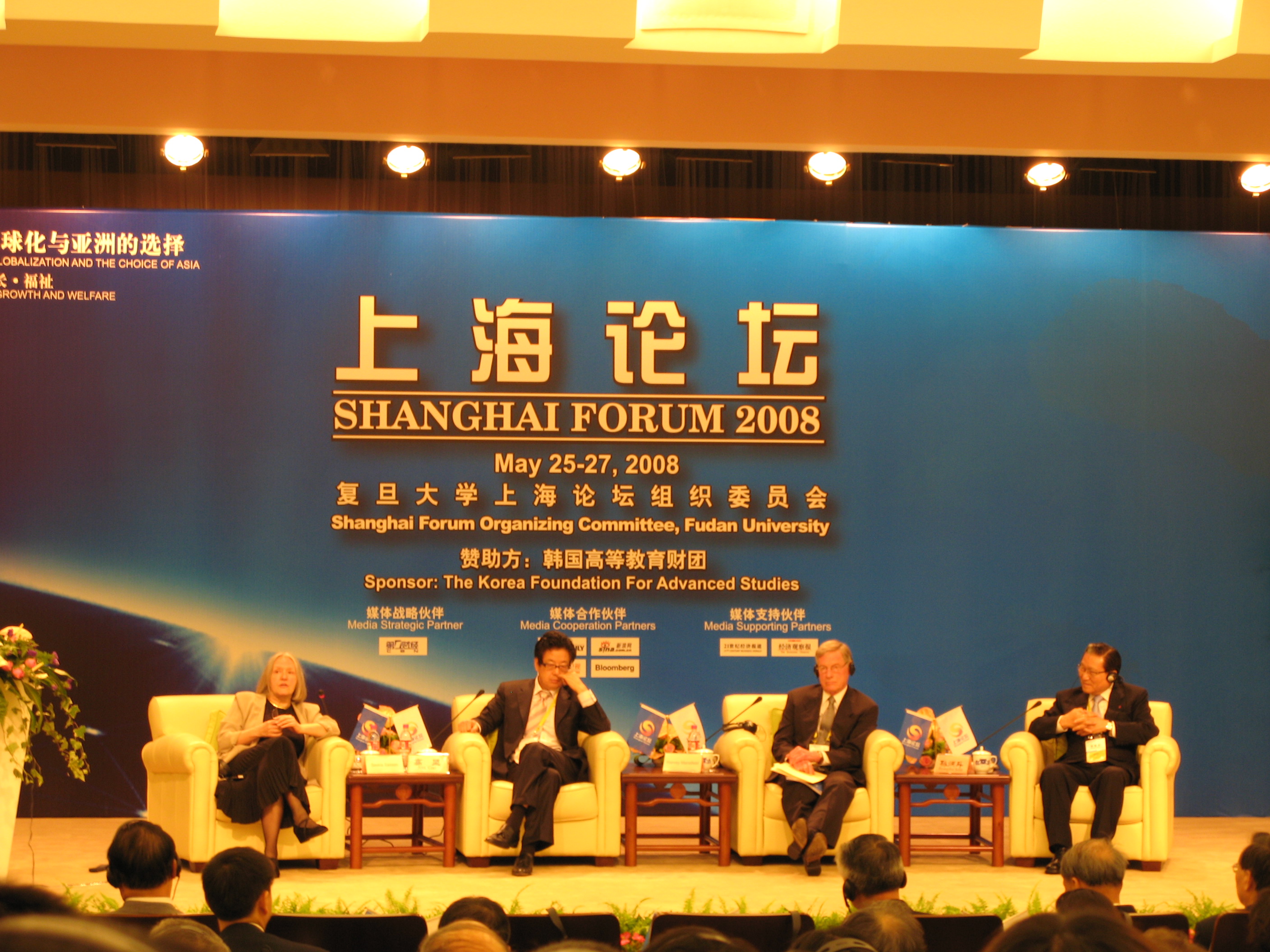 “上海论坛”是由复旦大学主办、韩国高等教育财团赞助的国际学术论坛。论坛以”关注亚洲、聚焦热点、荟萃精英、推进互动、增强合作、谋求共识”为宗旨,构建学界、政界、商界三方互动的交流平台,为当今全球经济和国际局势所面临的重大问题提供广泛、多维和深入的学术研讨,为亚洲经济、政治、社会和文化的全面进步提供政策建议和发展共识。第三届上海论坛–“上海论坛2008″围绕”经济全球化与亚洲的选择:转型?增长?福祉”这一主题,设置了若干分论坛,展开了为期3天的研讨。全国人民代表大会常务委员会副委员长陈至立、上海市市长韩正等分别在开幕式上致辞,原全国人大常务副委员长成思危、著名经济学家吴敬琏、韩国SK集团董事长崔泰源、美国耶鲁大学经济学教授Gustav-Ranis等在论坛上发表演讲。