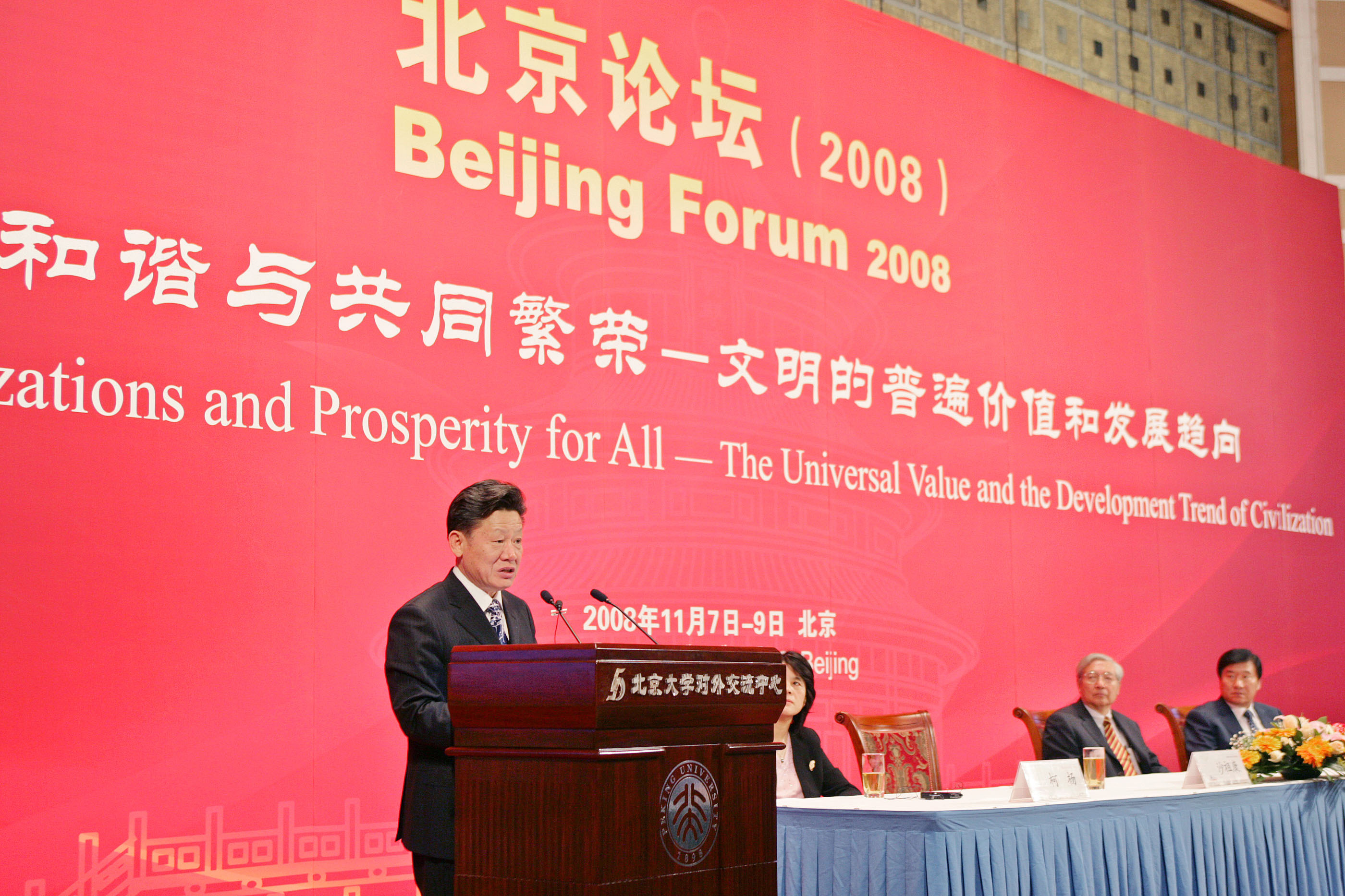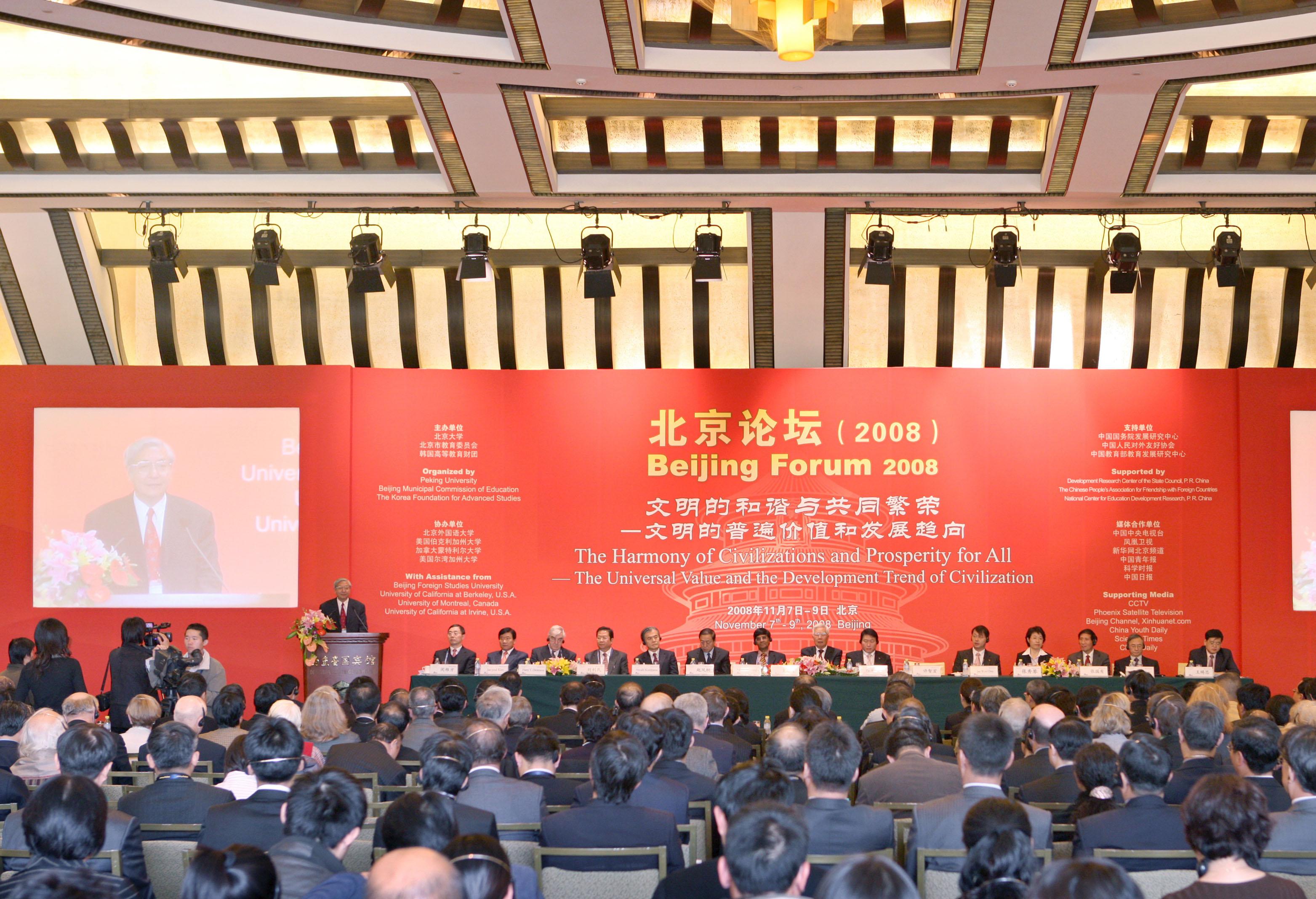 第五届北京论坛–北京论坛(2008)于2008年11月7-9日在北京隆重举行。来自44个国家和地区的314位知名专家学者围绕着”文明的和谐与共同繁荣–文明的普遍价值和发展趋向”这一主题,在”生态文明:环境、能源与社会进步”、”传统与现代的国家建构与政治文明”、”艺术的超越与文明的发展”、”奥林匹克精神与世界和谐”、”世界政治变迁与文明的互动”、”研究型大学圆桌会议:国际合作与大学发展”等六个领域对当今全球化时代下人类社会发展所面临的诸多问题进行了热烈的探讨。本届论坛共收到论文摘要255篇。参加本届论坛的还有来自23个国家和地区的53位大学校长。北京论坛(2008)为金秋的北京增添了浓厚的学术气氛,成为一次令人瞩目的盛会。