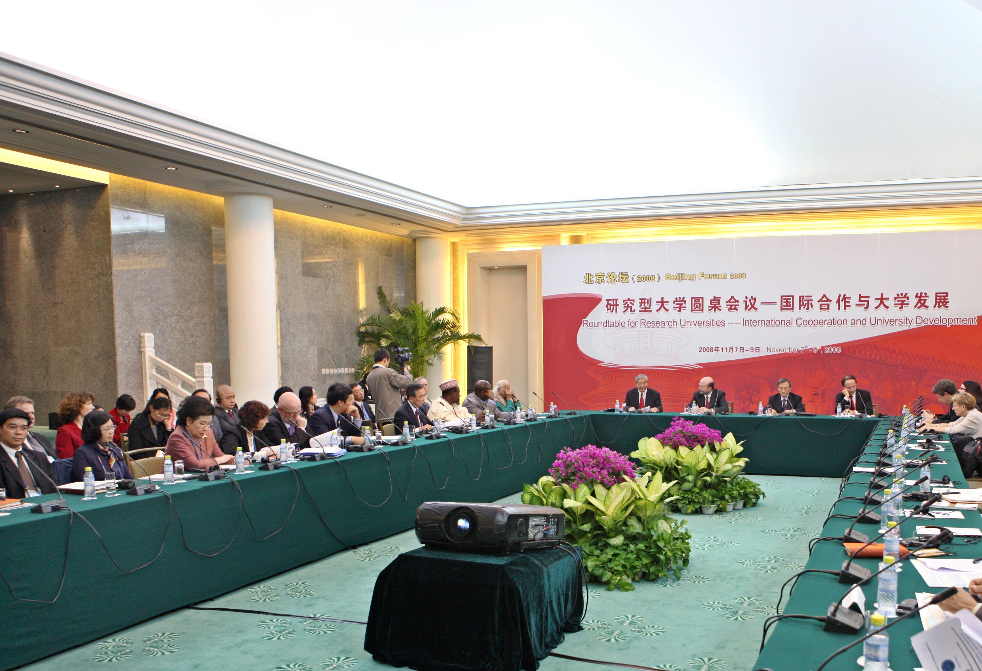 在11月7-9日的会期里,北京论坛(2008)的5个分论坛和1个圆桌会议共举办20多场次的专题讨论。中外学者依托北京论坛的学术平台,围绕”人类文明的普遍价值和发展趋向”这一问题发表真知灼见,并产生了诸多思想的共鸣和丰富的学术成果。其中,在北京论坛(2008)研究型大学校长圆桌会议上,来自全球二十多个国家和地区的大学校长齐聚一堂,就”国际合作与大学发展”的话题进行了交流与讨论。大学校长圆桌会议为介绍成功的国际化教育的模式和理念,促进国际高等教育界开展交流与合作提供了一个极佳的平台。